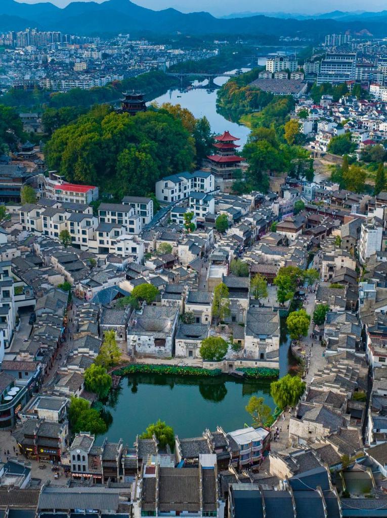 空から見た弦高古城。(ドローンから、2025年10月1日、婺源=新華社配信)