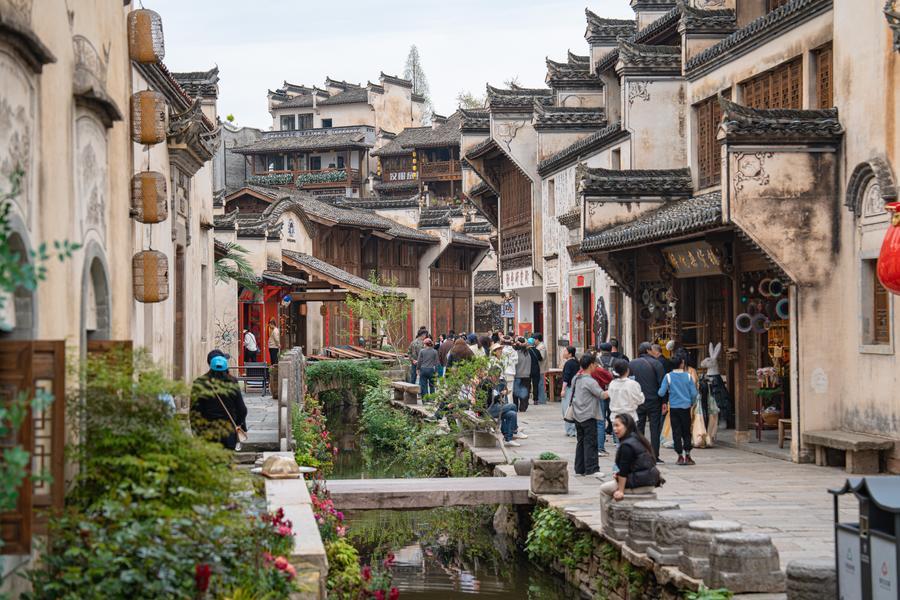 4日、弦高古城内にある西湖凼文化観光街区の街並み。(婺源=新華社配信)