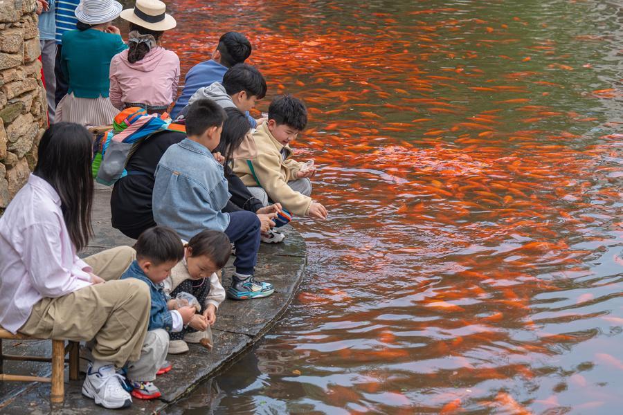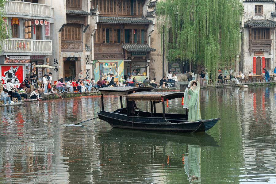 2日、観光客でにぎわう弦高古城。(婺源=新華社配信)