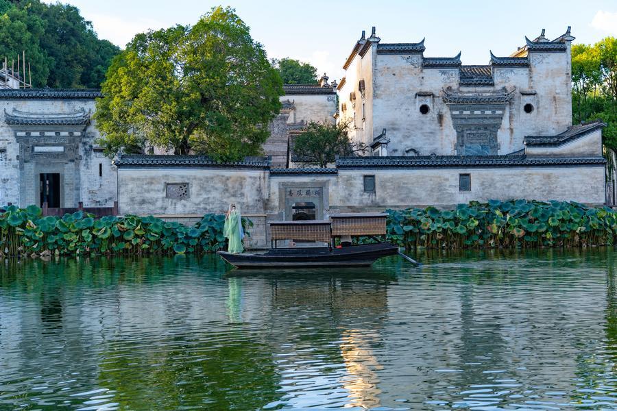 2日、復元された婺源西湖で無形文化遺産のパフォーマンスを披露する演者。(婺源=新華社配信)