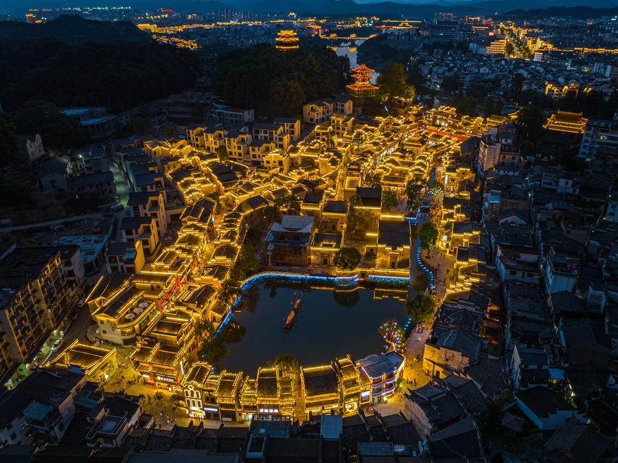 弦高古城の夜景。(ドローンから、2025年6月26日、婺源=新華社配信)