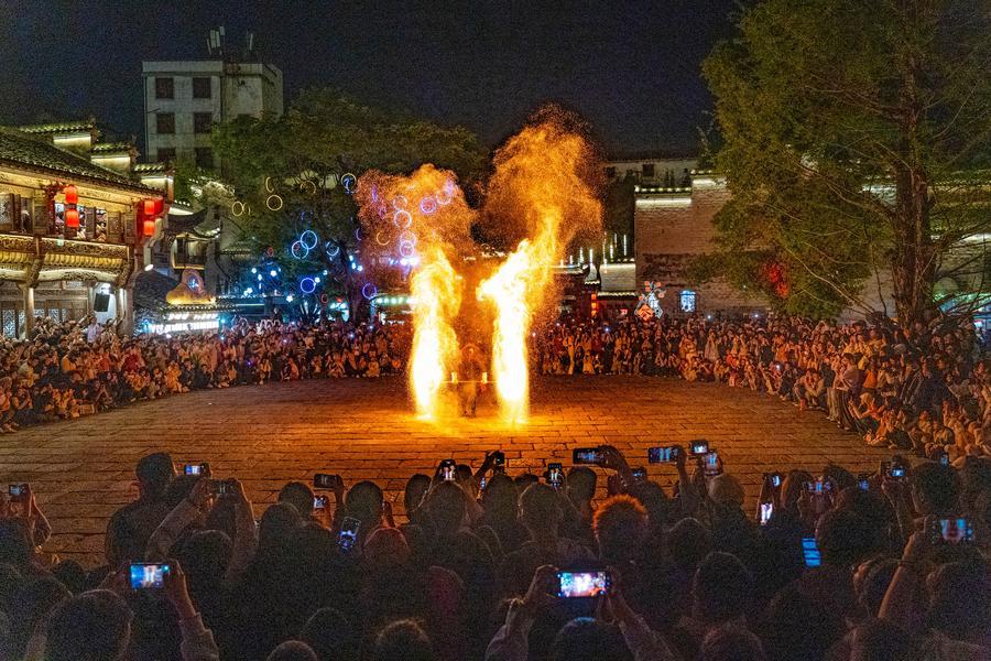 4日、弦高古城で行われた「火壺」のパフォーマンス。(婺源=新華社配信)