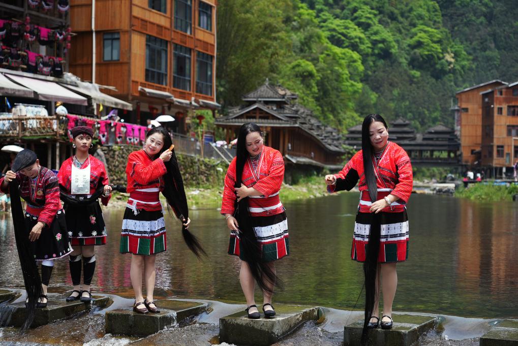 【新華社桂林4月21日】中国広西チワン族自治区桂林市竜勝各族自治県金江村で19日、紅ヤオ族(ヤオ族の支族)による年に一度の「長髪祭り」が開催された。人々は整髪の実演やファッションショー、民謡の掛け合い、踊りなどを楽しみ、旧暦3月3日の伝統的な祝日「三月三」を過ごした。