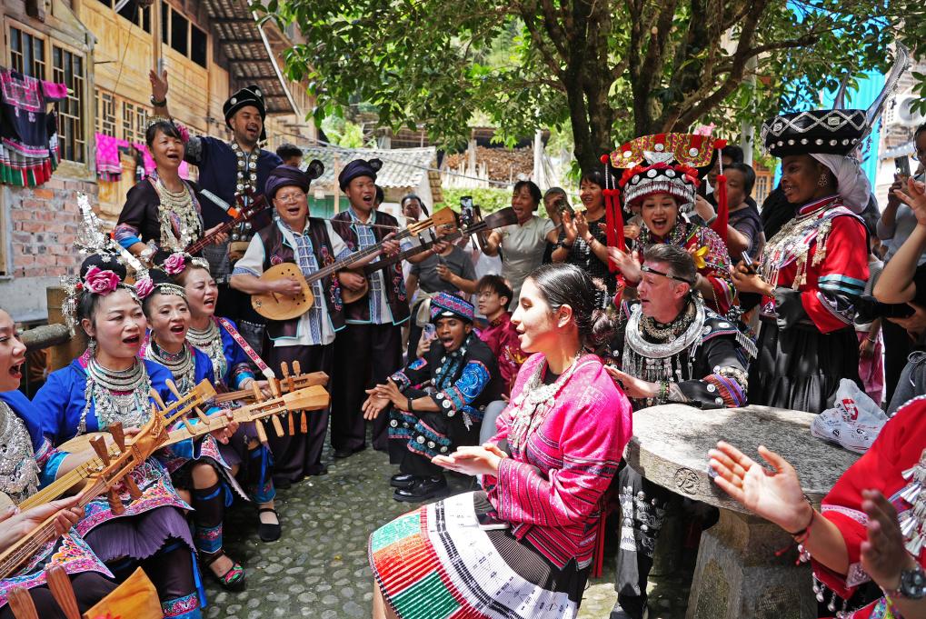 19日、桂林市竜勝各族自治県金江村で、外国人と民謡の掛け合いをする人々。(竜勝=新華社配信/韋吉陽)