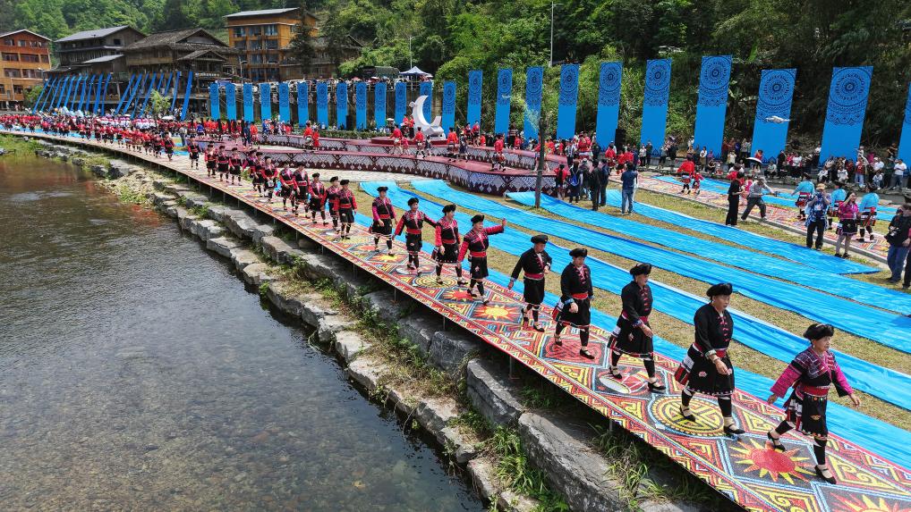 19日、桂林市竜勝各族自治県金江村でファッションショーに参加した人々。(ドローンから、竜勝=新華社配信/韋吉陽)