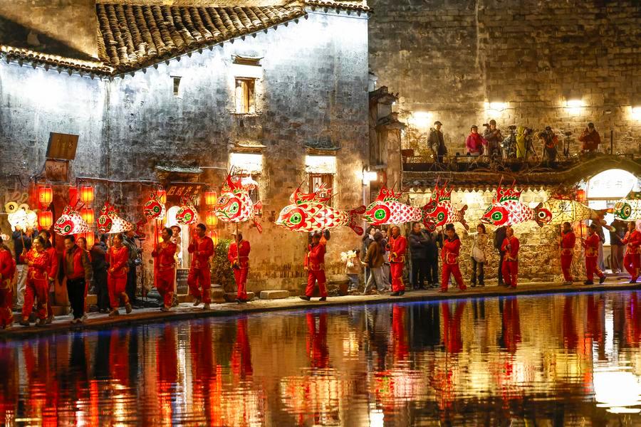 魚灯を掲げ、黄山市歙(きゅう)県の瞻淇(せんき)村を練り歩く出演者。(2月14日撮影、黄山=新華社配信/施亜磊)