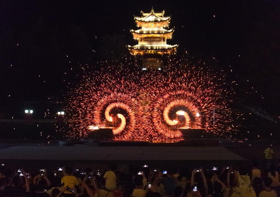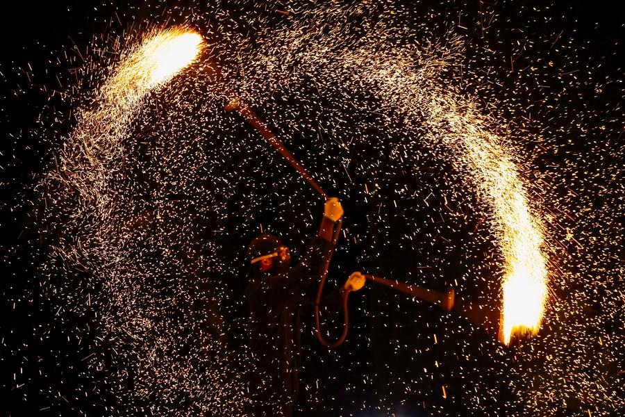 黄山市休寧県の斉雲山風景区で披露された「打鉄花」。溶かした鉄を空に向けて振りまく。(2025年10月4日撮影、黄山=新華社配信/施亜磊)