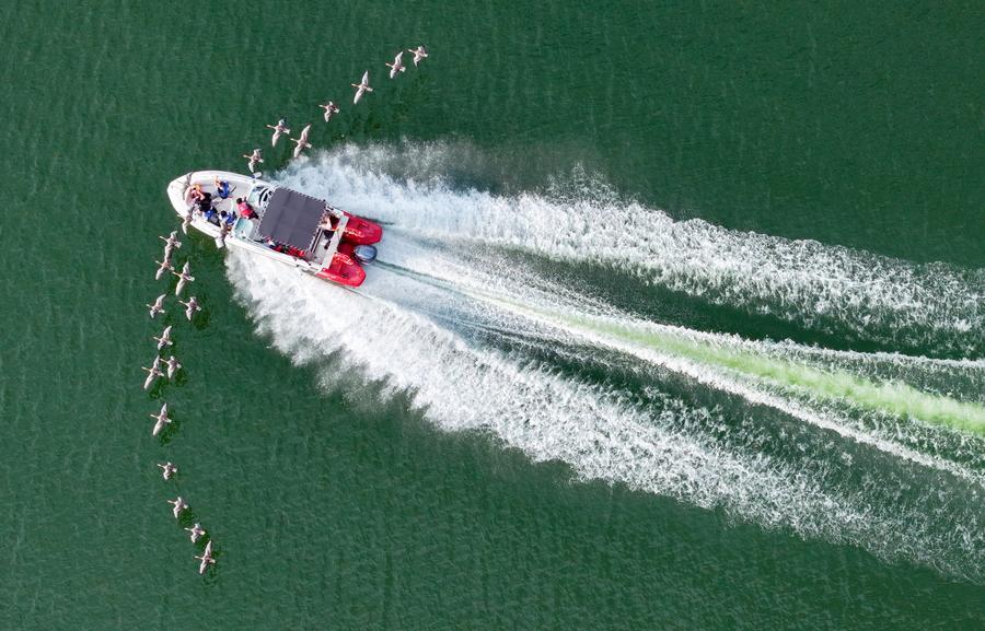 黄山市歙(きゅう)県を流れる新安江で、ボートから水鳥の群れを眺める観光客。(2025年8月20日、ドローンから、黄山=新華社配信/施亜磊)