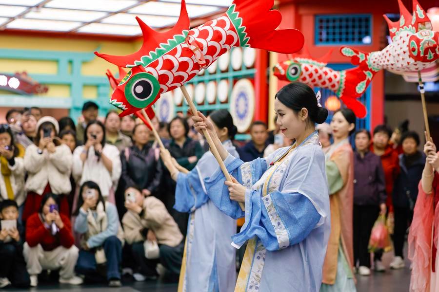 黄山市歙(きゅう)県の徽州古城で披露された無形文化遺産の魚灯舞踊「魚影潤新安」。(2025年12月19日撮影、黄山=新華社配信/施亜磊)
