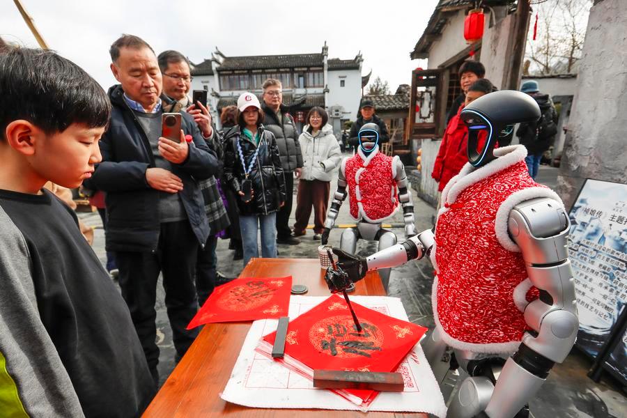 黄山市黟県の西逓古村で双方向型のパフォーマンスを披露するロボット。(2月18日撮影、黄山=新華社配信/施亜磊)