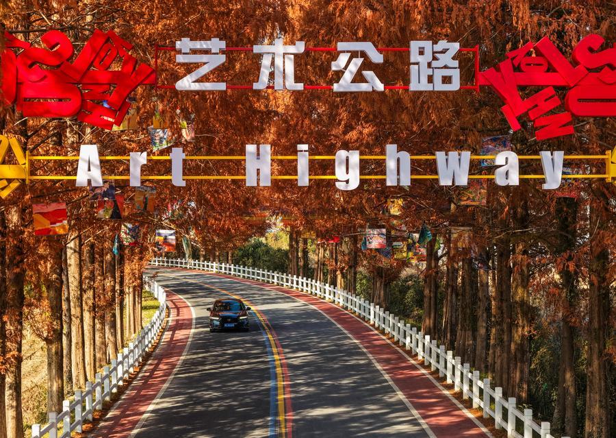 黄山市休寧県斉雲山鎮の「アートハイウエー」を走る車。(2025年12月6日、ドローンから、黄山=新華社配信/施亜磊)