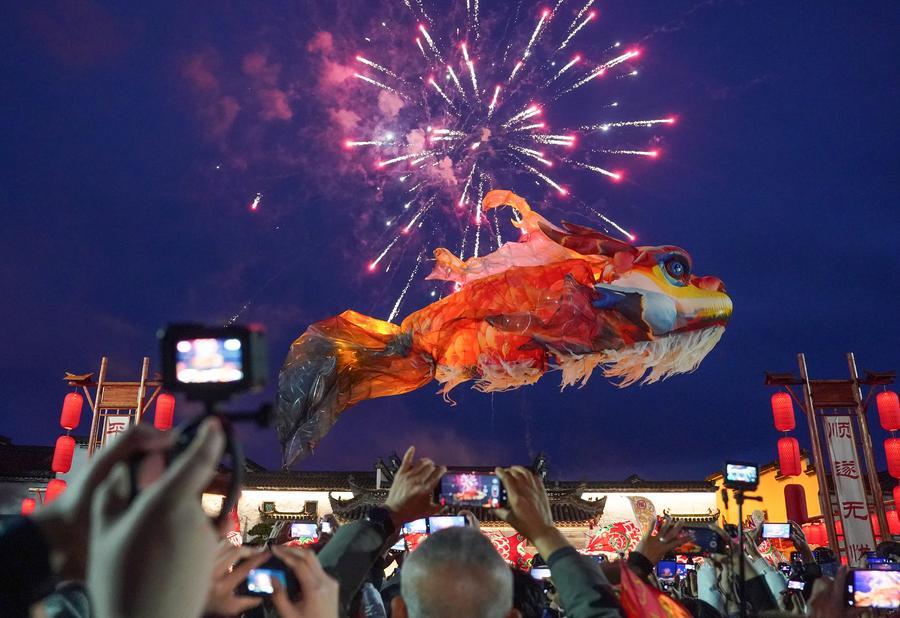 黄山市徽州区の呈坎(ていかん)古村で行われた魚灯のパレード。(1月20日、ドローンから、黄山=新華社配信/施亜磊)