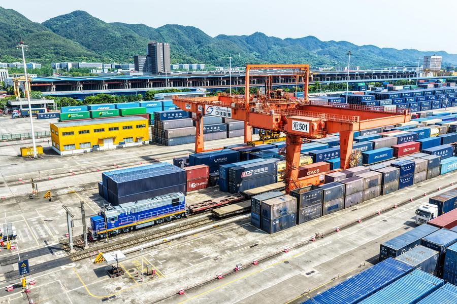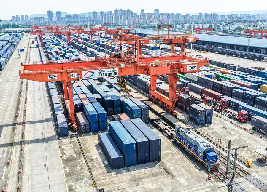 23日、重慶市の団結村駅で出発を待つ中欧班列。(ドローンから、重慶=新華社記者/唐奕)