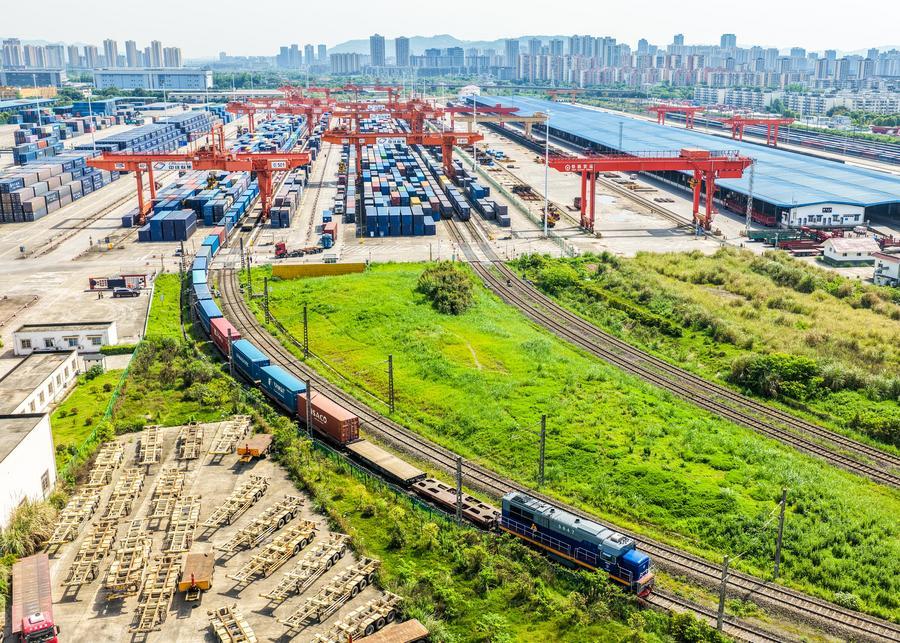 23日、重慶市の団結村駅を出発した中欧班列。(ドローンから、重慶=新華社記者/唐奕)