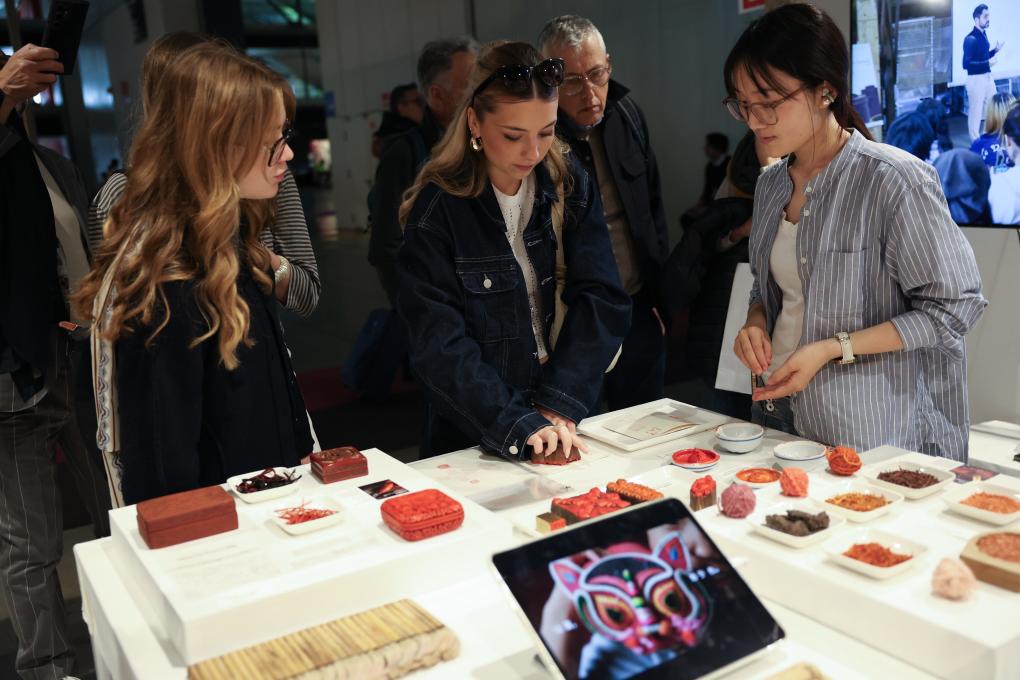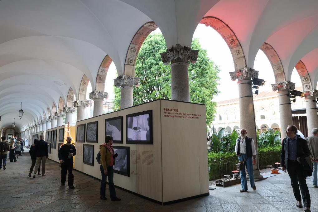 20日、ミラノ大学で、ミラノデザインウイークの「中国無形文化遺産工匠(職人)展」を見学する来場者。(ミラノ=新華社記者/李京)