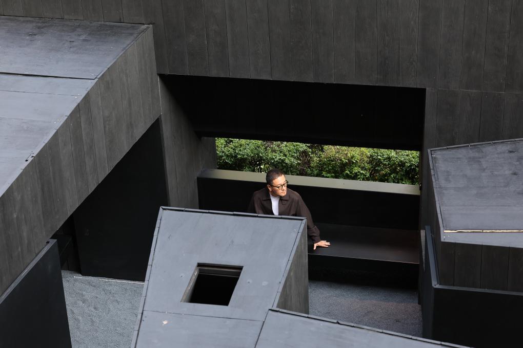 20日、ミラノ大学で、インスタレーション作品「奥庭」とともにミラノデザインウイークに参加した中国の空間デザイナー、呉浜(ご・ひん)氏。(ミラノ=新華社記者/李京)