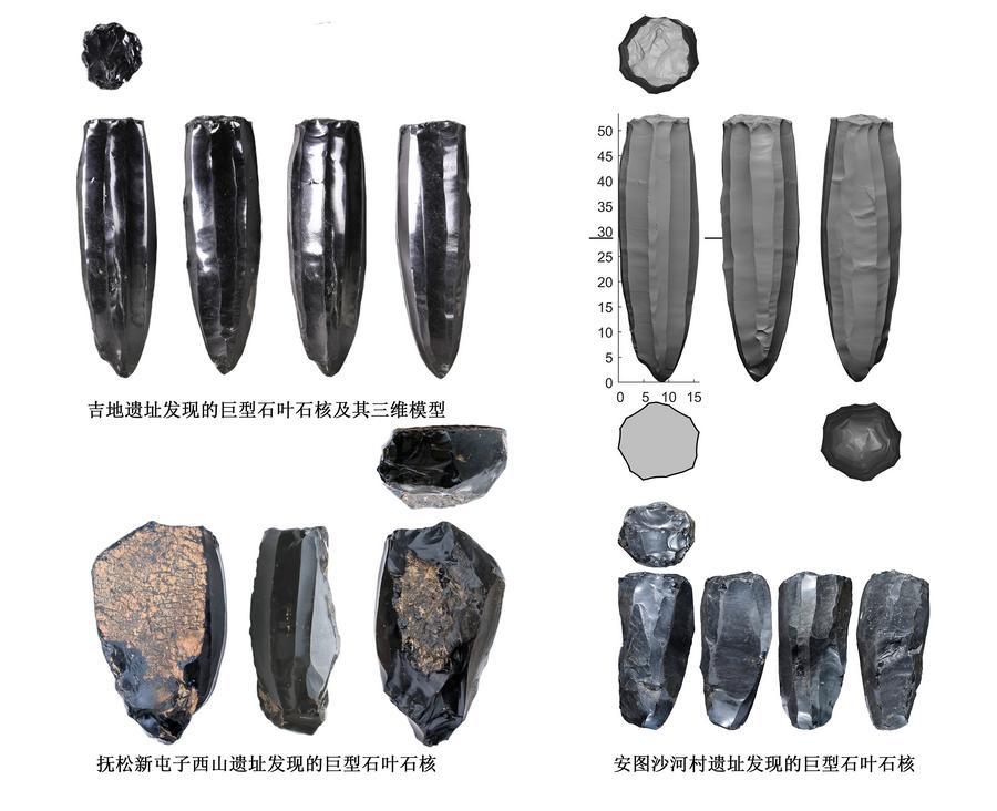 吉林省長白山地域で出土した大型石刃石核。(北京=新華社配信)