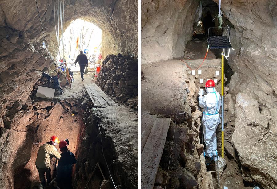 吉林省樺甸寿(かでんじゅ)山の仙人洞遺跡で発掘に当たる調査隊メンバー。(北京=新華社配信)