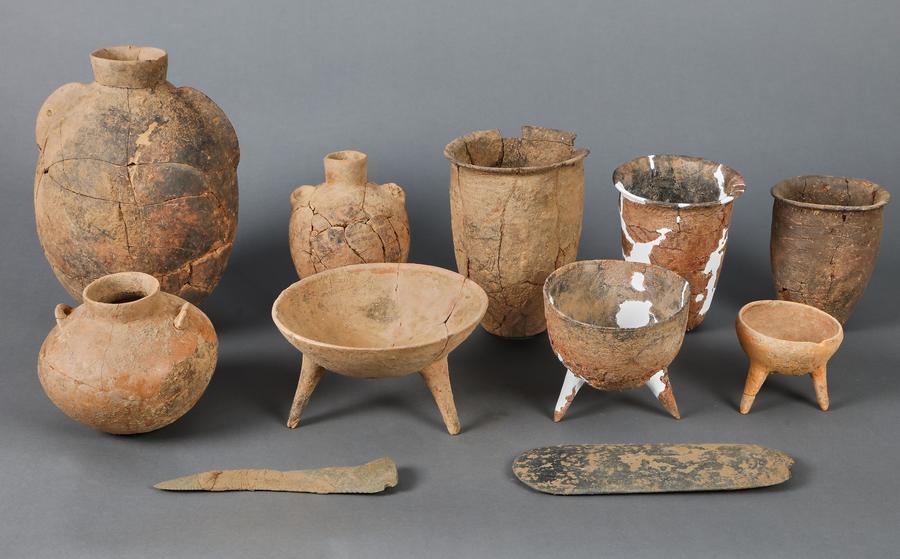 裴李崗遺跡(河南省新鄭市)西部墓葬区「M85」墓出土の器物。(北京=新華社配信)