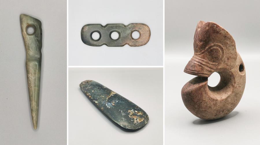 鄭家溝遺跡(河北省張家口市宣化区)1号積石塚出土の玉器。(北京=新華社配信)