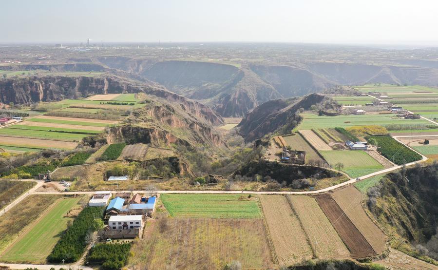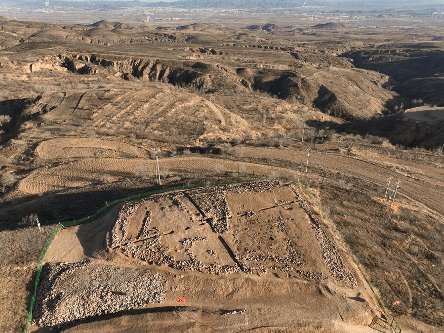 南佐遺跡(甘粛省慶陽市)中核エリアの地形。(ドローンから、北京=新華社配信)