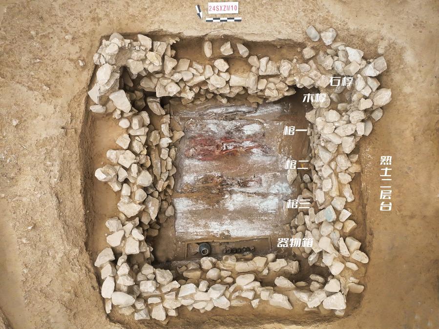 鐘村遺跡(山西省昔陽県)「M10」墓の棺椁(かんかく=内棺と外棺)構造。(北京=新華社配信)