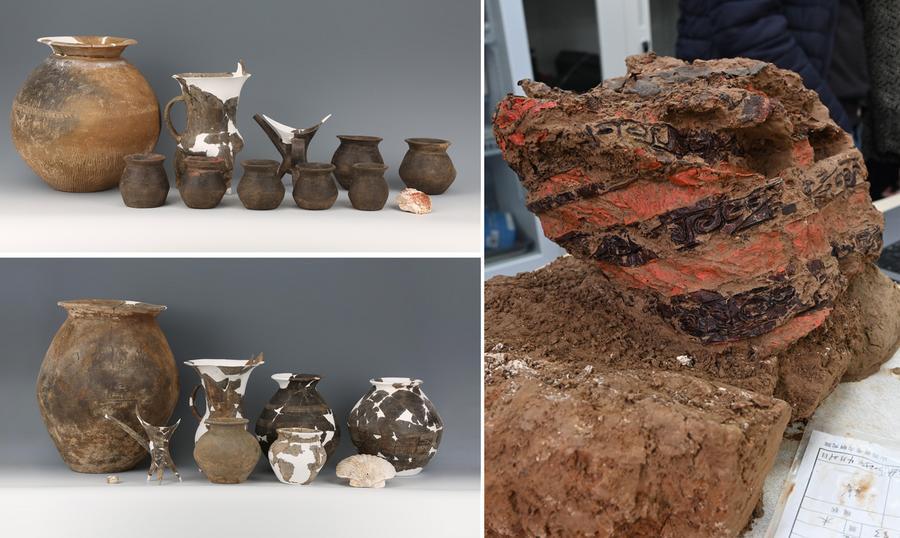 鐘村遺跡(山西省昔陽県)「M10」墓出土の器物(左上)。「M13」墓出土の器物(左下)。鐘村遺跡出土の漆器。(北京=新華社配信)
