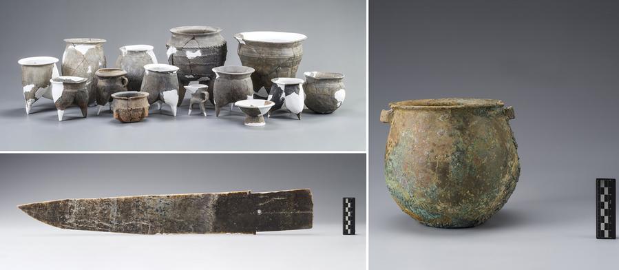 商城遺跡(河南省鄭州市)の南西部出土の土器(左上)。南東部出土の玉戈(ぎょくか、左下)。南東部出土の銅製水くみ器。(北京=新華社配信)