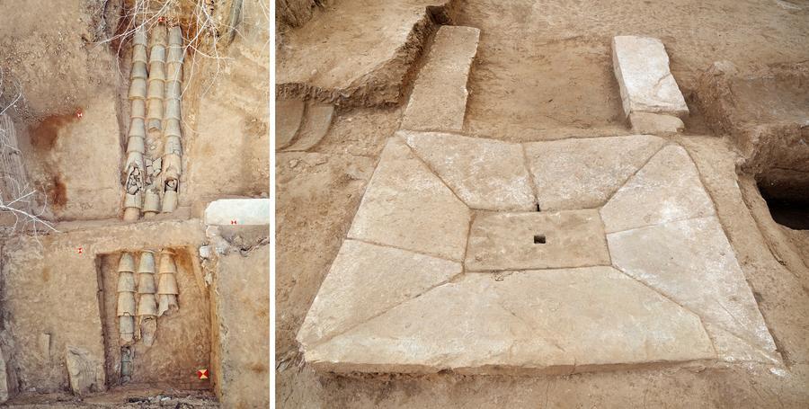 琅琊台遺跡(山東省青島市)山頂部の建物基礎で見つかった排水施設。(北京=新華社配信)