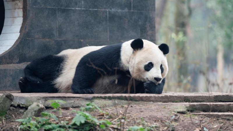 パンダの「珍珍」、うつぶせで休憩 中国四川省