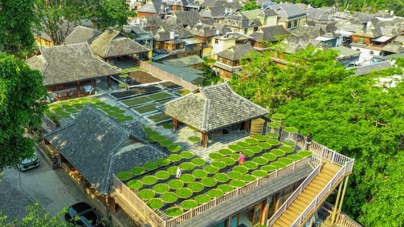 中国雲南・景邁山で春茶の収穫 屋上で茶葉を天日干し