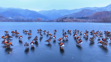 【映像】貯水池がオシドリの越冬地に 中国山東省