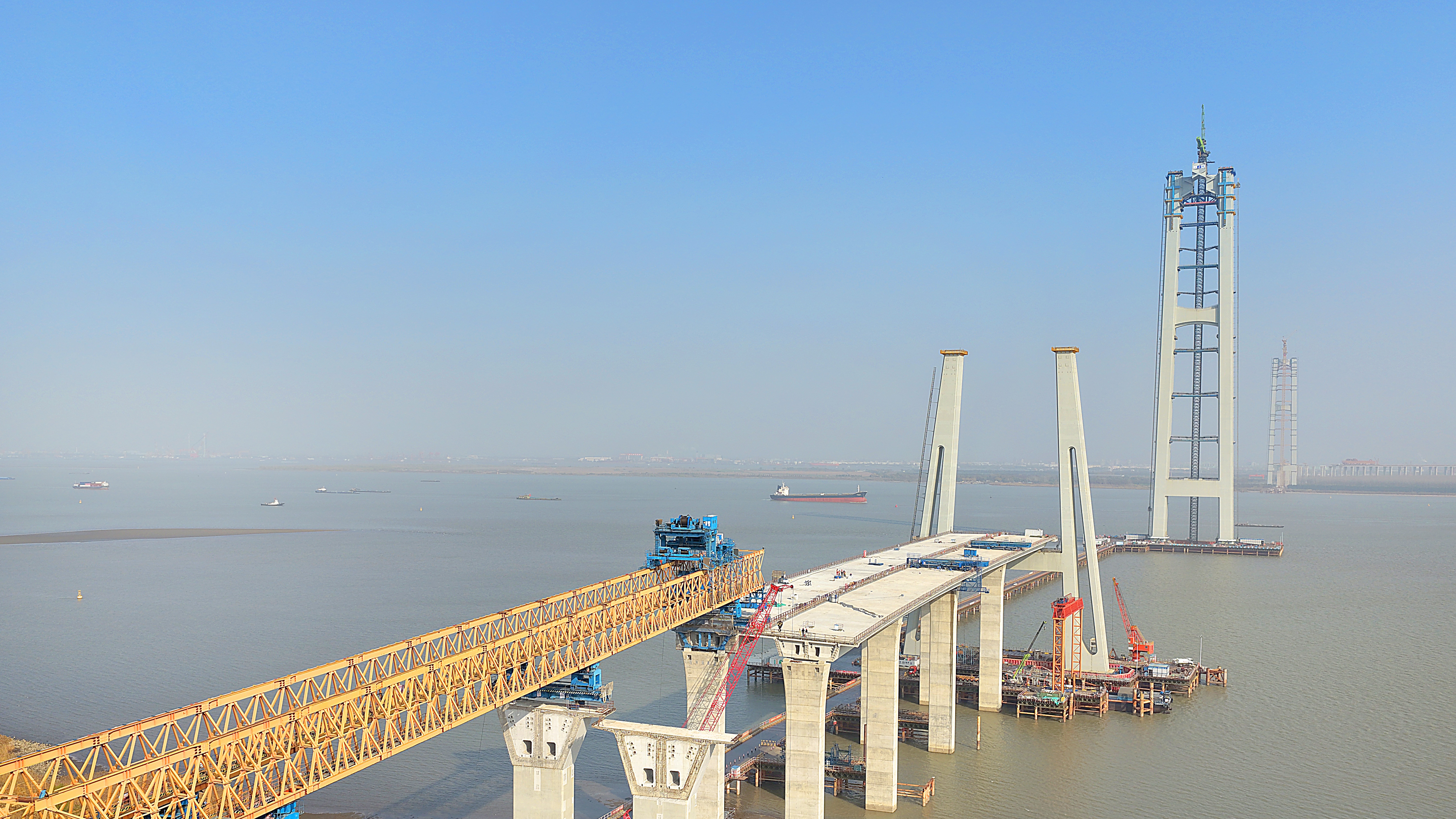 張靖皋長江大橋、南航路橋の主塔頂部が完成 中国江蘇省 2025-12-02