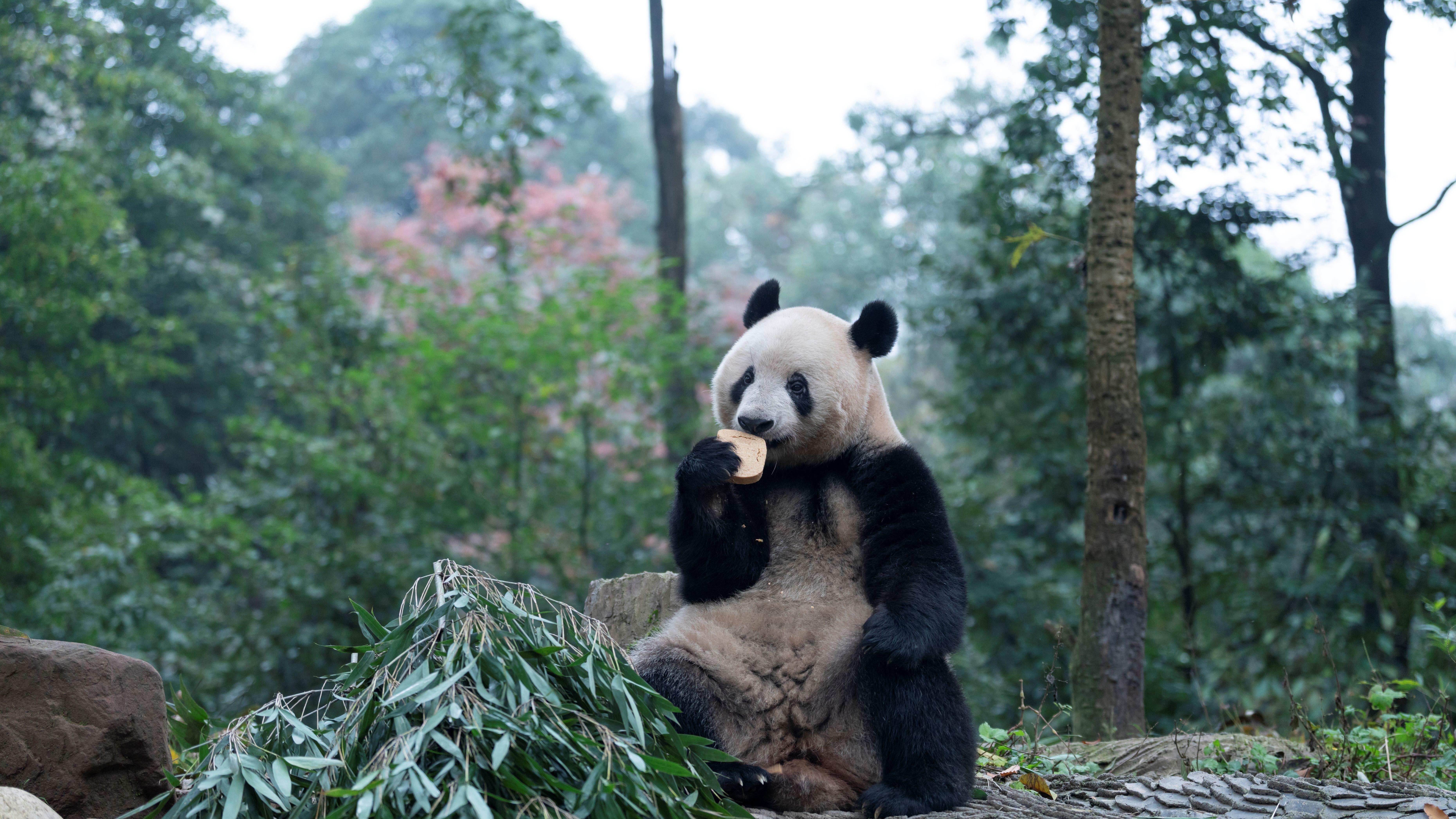 パンダのシャンシャン、蒸しパンを味わう 中国四川省