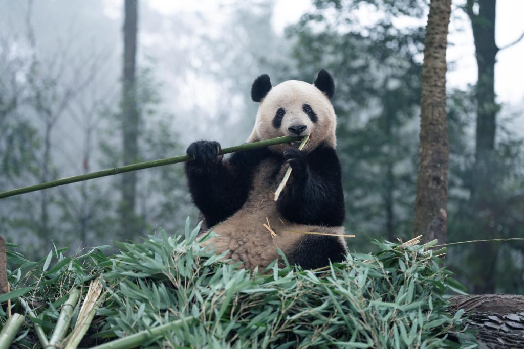 竹を折るパンダのシャンシャン 中国四川省