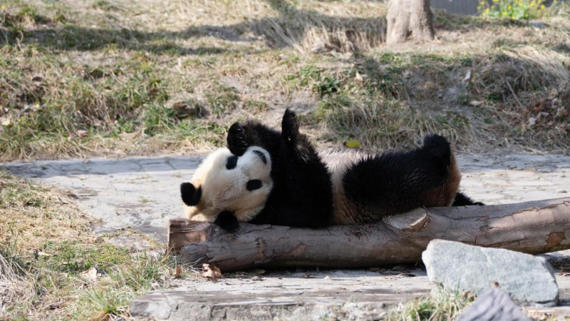 パンダのリーリー、背中をごしごし 中国四川省