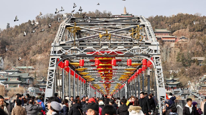 黄河鉄橋に新春彩るランタン 中国・甘粛省蘭州市