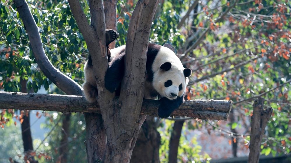パンダの福宝、のんびり休憩 中国四川省