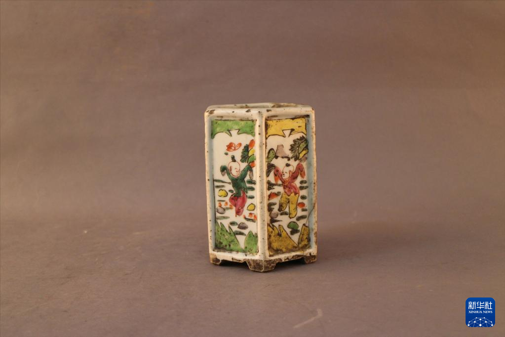 江西省博物館に所蔵する清代の筆立て「五彩嬰戯文六方筆筒(ごさいえいぎもんろくほうひっとう)」。2人の子どもがかわいらしい表情と動作で踊りを踊る様子が描かれている。(南昌=新華社配信)