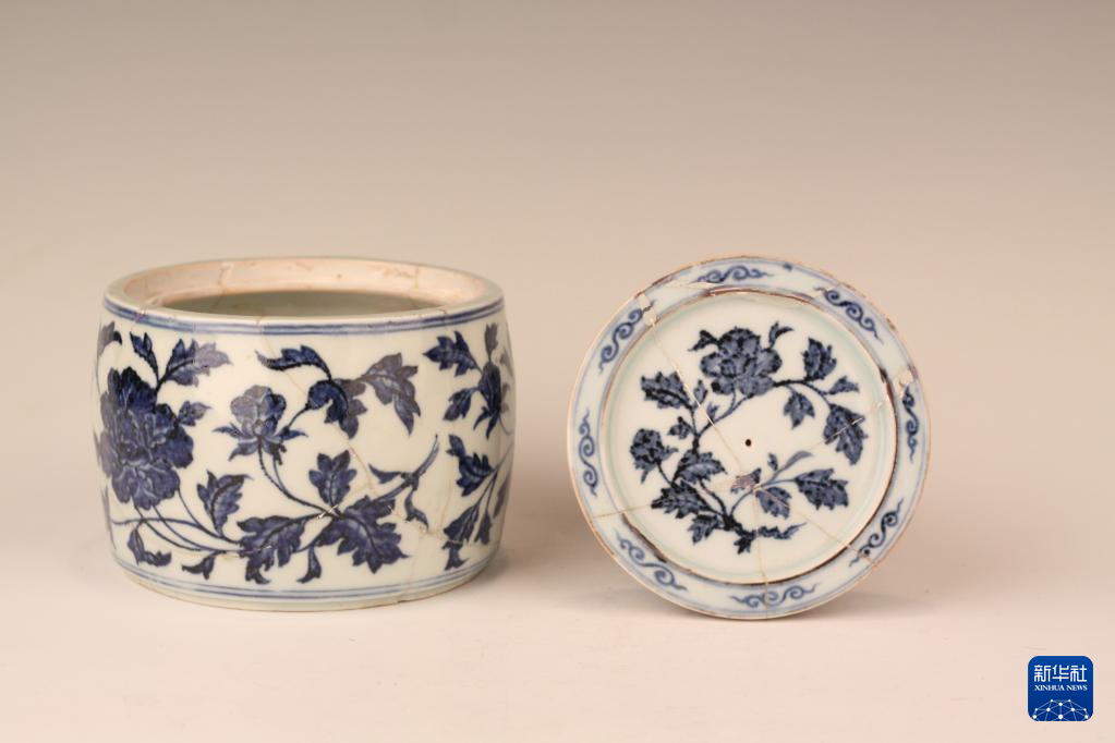 江西省景徳鎮市の明清御窯廠(ぎょようしょう)遺跡から出土した青花纏枝牡丹文蟋蟀罐(せいかてんしぼたんもんしっそつかん)。景徳鎮御窯博物院の翁彦俊(おう・げんしゅん)院長によると、構図や筆意が明の宣徳帝・朱瞻基(しゅ・せんき)の御筆画によく似ており、高台やふたの裏側に「大明宣徳年製」の楷書の銘款があることから、宣徳期の宮中でコオロギ遊びが流行していたことを証明する物であるとともに、当時の皇帝のおもちゃだった可能性もあるという。(南昌=新華社配信)pagebreak