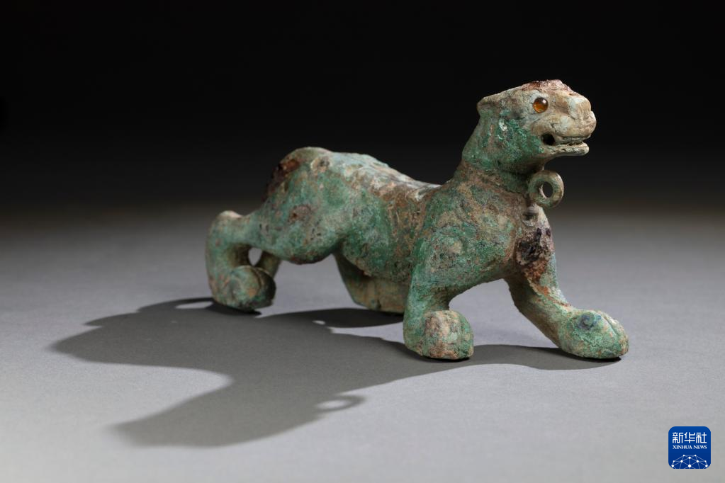 江西省南昌市の漢代海昏侯国遺跡から出土した長さ15センチ、高さ8・5センチの青銅の虎。滑車が付いており、前漢の海昏侯、劉賀(りゅう・が)の長男である劉充国(りゅう・じゅうこく)が生前こよなく愛したおもちゃの車とされる。(南昌=新華社配信)