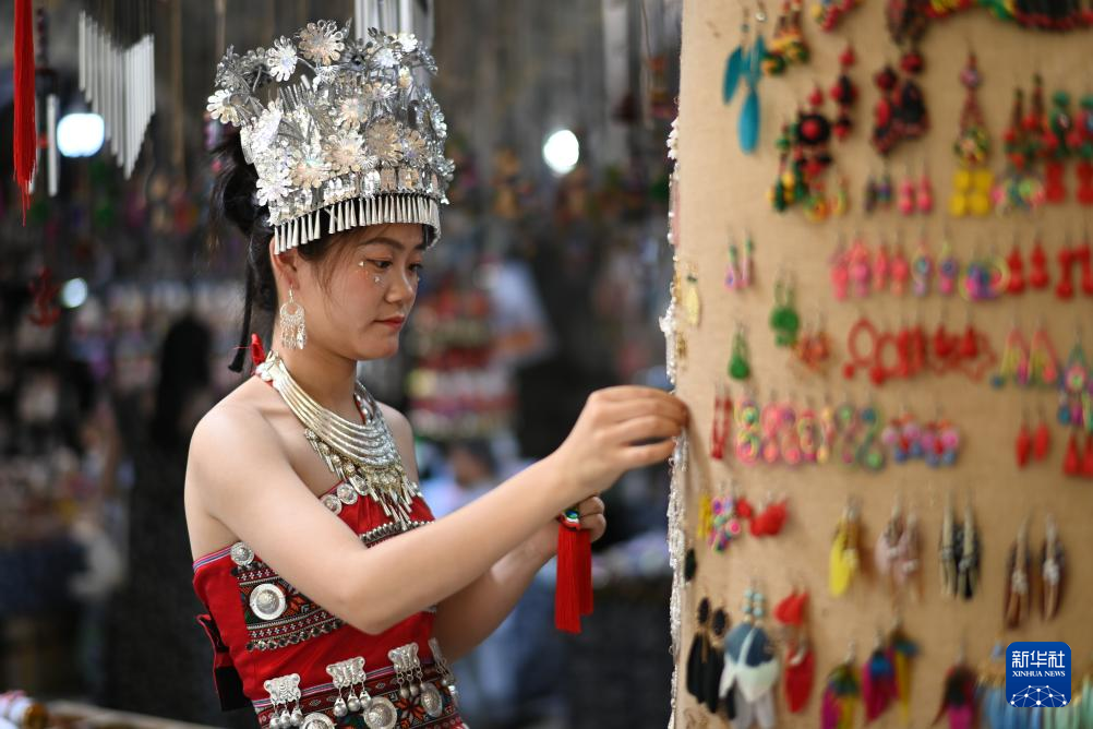 15日、貴陽市花渓区の夜郎谷でアクセサリーを選ぶ観光客。(貴陽=新華社記者/楊楹)pagebreak