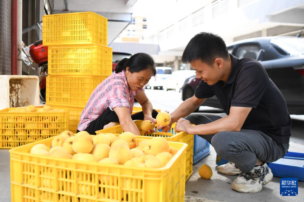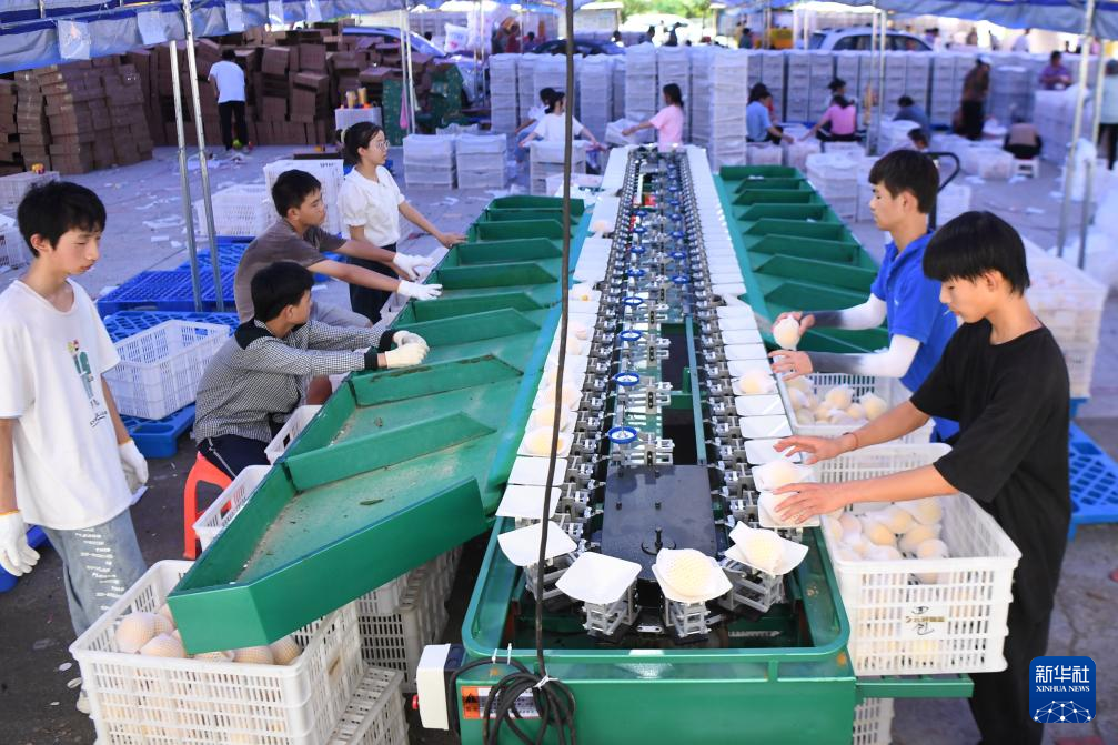 8日、炎陵県下村郷の黄桃買付けセンターで黄桃を仕分ける従業員。(炎陵=新華社記者/薛宇舸)pagebreak