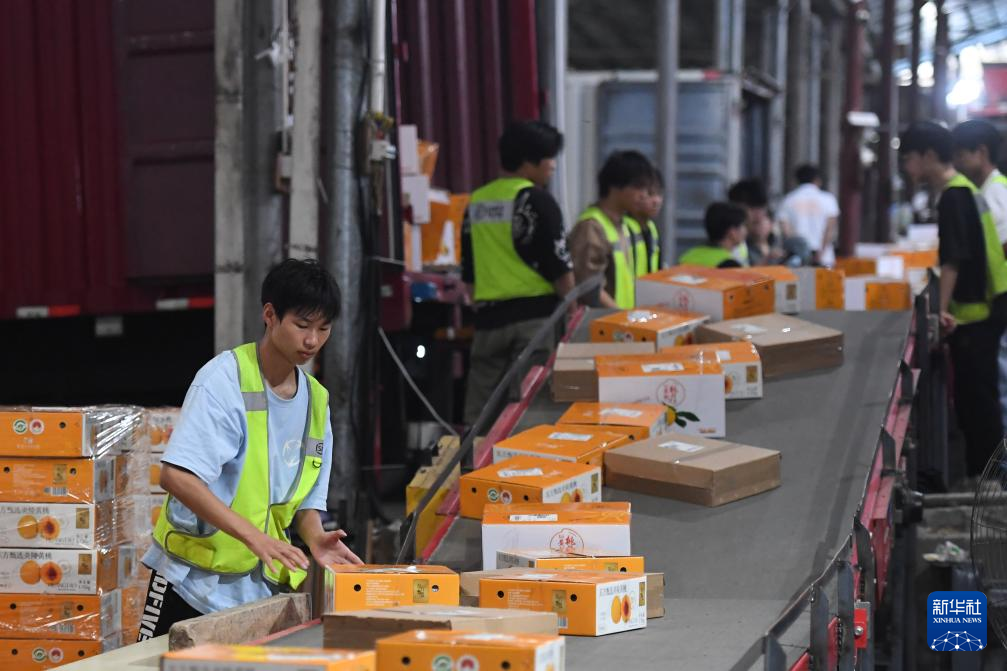 8日、中国物流大手、順豊速運(SFエクスプレス)の炎陵黄桃プロジェクト営業所で黄桃を積み込むスタッフ。(炎陵=新華社記者/薛宇舸)