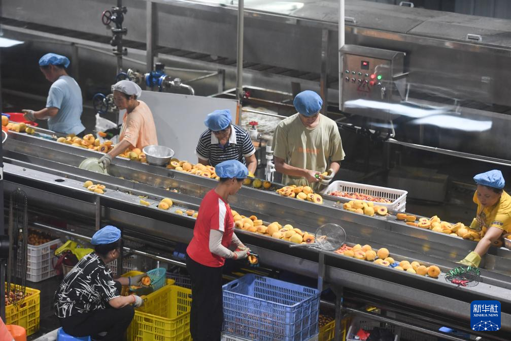 8日、炎陵県の湖南娜妹子食品で黄桃の缶詰加工に精を出す従業員。(炎陵=新華社記者/薛宇舸)pagebreak