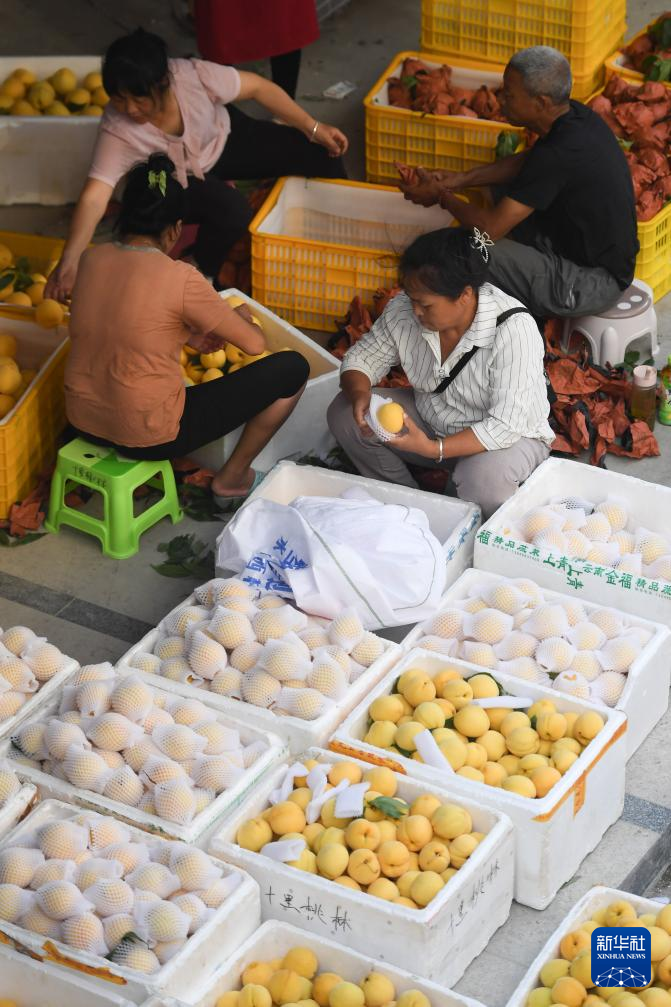 8日、炎陵県水口鎮の黄桃市場で、黄桃を選別し梱包する農家の人。(炎陵=新華社記者/薛宇舸)pagebreak