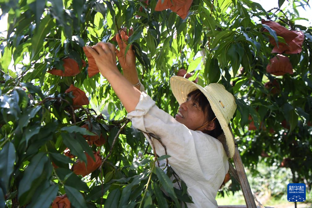 8日、炎陵県下村郷坳頭村で、黄桃を収穫する農家の人。(炎陵=新華社記者/薛宇舸)
