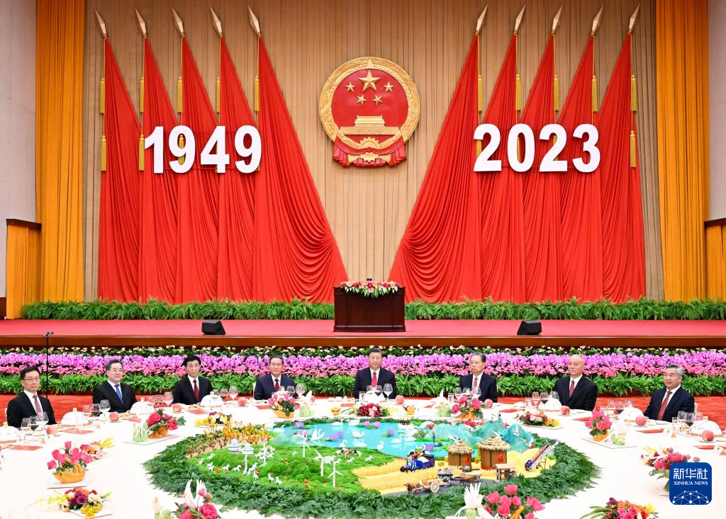 中華人民共和国成立74周年祝賀レセプションが28日夜、北京の人民大会堂で開かれた。習近平(しゅう・きんぺい)、李強(り・きょう)、趙楽際(ちょう・らくさい)、王滬寧(おう・こねい)、蔡奇(さい・き)、丁薛祥(てい・せつしょう)、李希(り・き)、韓正(かん・せい)各氏ら党と国家の指導者および国内外の関係者が出席した。(北京=新華社記者/申宏)