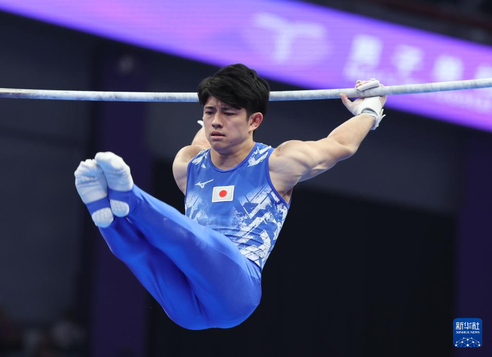 29日、鉄棒の演技をする日本の谷川翔。(杭州=新華社記者/程婷婷)