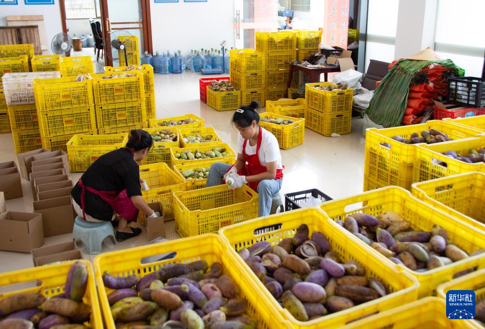 9月20日、湖南省永州市藍山県の食品企業、湖南競博食品科技でアケビに緩衝材をかぶせる従業員。(永州=新華社記者/柳王敏)
